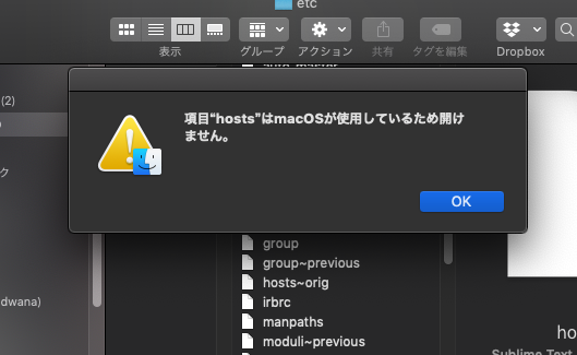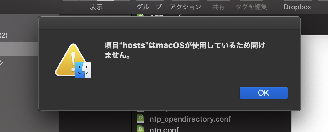 hostsファイルの編集をしたいのですが、 項目“hosts”はmacOSが使用しているため開けません。 と表示され編集が出来ません。
