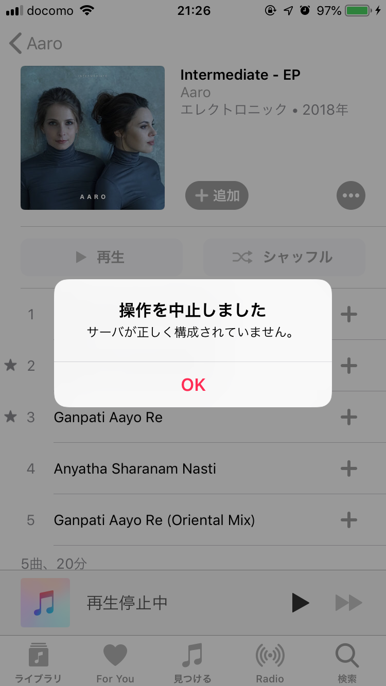 キャリア回線、プロバイダー回線共にとある曲をストリーミング再生しようとすると、「サーバが正しく構成されていません」とメッセージが表示され、再生することができません。