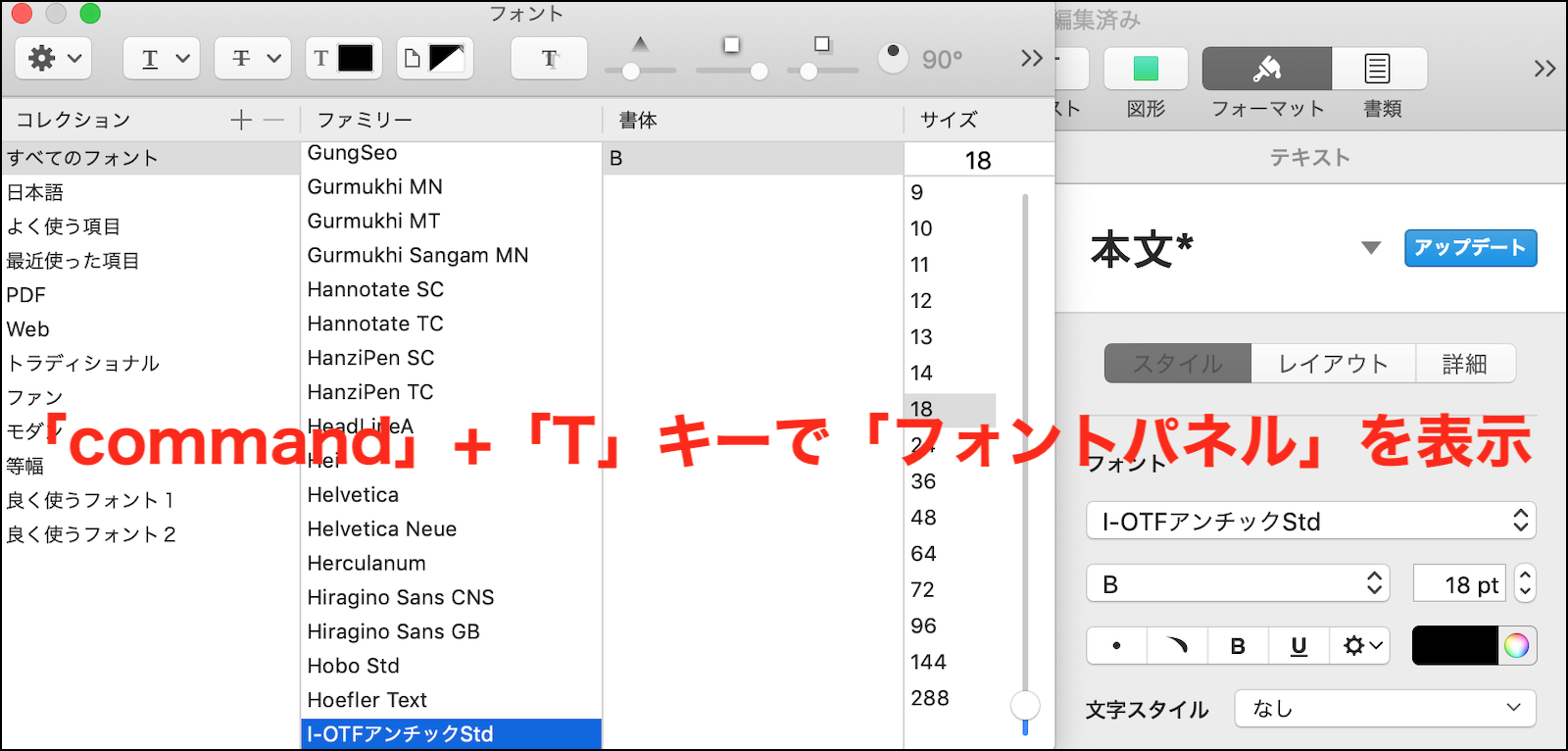 下の画像の様に、「Pages」で「command」+「T」キーを押して「フォントパネル」を表示させ、インストールしたフリーフォントを選択して下さい。