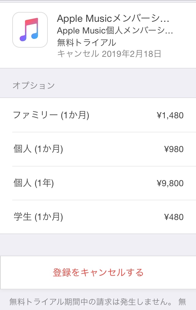 なので、Apple Music メンバーシップ 個人(1か月)を解約する場合は、再度「登録をキャンセル」する必要が有ると思います。