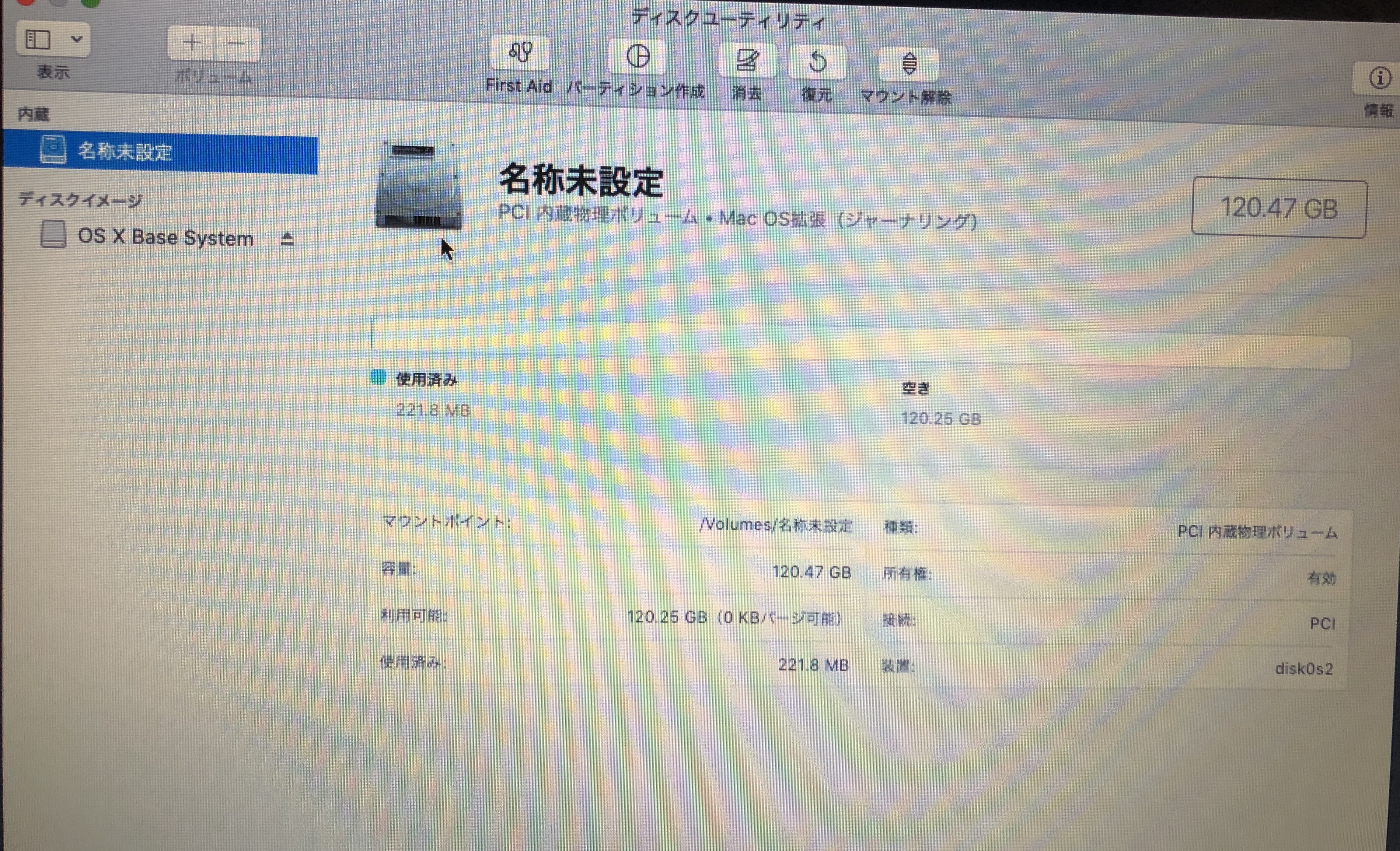 いま、「ディスクユーティリティ」の「内臓」というところには「名称未設定」があるだけです。