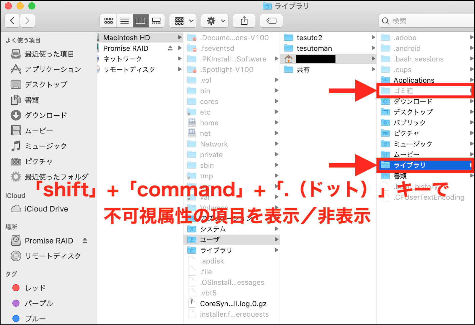 不可視属性の項目の表示/非表示は、下の画像の様に「shift」+「command」+「.(ドット)」キーで行います。