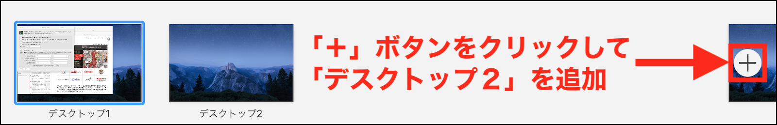 「F3(「Mission Control」)」キー、またはジェスチャ(3本指または4本指で上にスワイプ)で、「Mission Control」画面を表示させ、下の画像の様に画面右上の「+(追加)」ボタンをクリックして、「デスクトップ2」を追加して下さい。