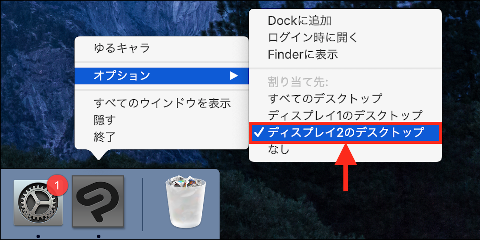 「デスクトップ1」で下の画像の様に、「Dock」上の「CLIP STUDIO PAINT.app」アイコンを右クリックすると表示されるメニューから、「オプション」>「ディスプレイ2のデスクトップ」を選択して見て下さい。