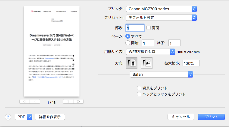 「用紙サイズ」で、作成した「カスタムサイズ」が選択されている事を確認して印刷します。