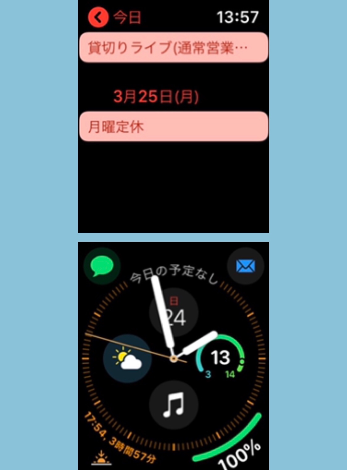 アップルウォッチのカレンダーを開くと画像の通りちゃんとスケジュールがあるのに(つまりちゃんと同期されてる)、文字盤のコンプリケーションには「今日の予定なし」と表