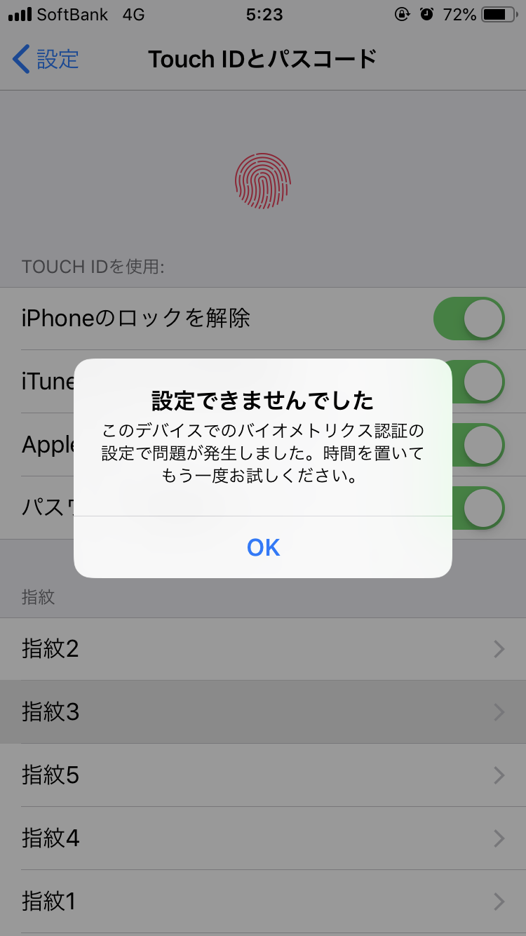 同日にApp Storeでアプリをダウンロードしようとしたところ、『Apple IDのパスワードを入力してください』の画面はでるのですが、Touch IDの画面が出てこなくなり、Touch IDでのインストールができません。設定のTouch IDとパスコードにて確認しましたが、iTunes StoreとApp Storeは設定ONになっていた為、一度OFFにし再度ONにしました。そうしましたら、ONにはなるのですが『このデバイスでのバイオメトリクス認証の設定で問題が発生しました。時間を置いてもう一度お試しください。』というメッセージが出てきたので、時間を置いて再度試しましたがまた同じメッセージが出て(設定は一応ONになっている)、App StoreでのTouch IDはダメでした。