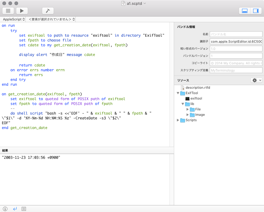 なお、AppleScript をスクリプトバンドル形式で保存し、その中に exiftool をインストールしてください。ハードルは高めですが、一応貼っときますね。もし他に方法がない場合はトライしてみてください。