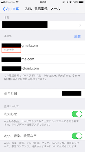 2)キャリアのメールアドレスのApple IDの編集画面で、代替のメールアドレスとして(あるいは、追加の連絡先として)、@icloud.comのメールアドレスを追加できないでしょうか?