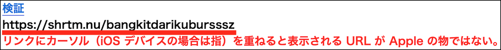 2)メールの本文にある、『検証>』のリンクに指を乗せたままにするか、マウスポインターを乗せると、リンク先のURLが表示されます。 そのURLがApple IDの管理サイトの正規のURL(https://appleid.apple.com/)と異なることを確認して下さい。 このURL以外にはあり得ず、そのURL以外は全て偽りのサイトになります。