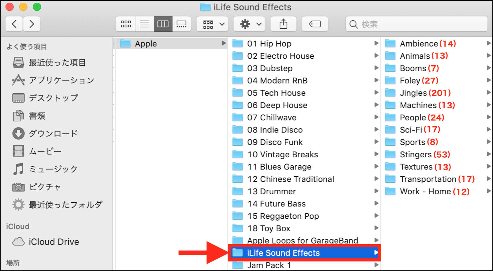 「Apple」フォルダ内に「iLife Sound Effects」フォルダが存在している場合は、下の画像の様に「iLife Sound Effects」フォルダ内に各フォルダが存在している事と、各フォルダ内のオーディオファイルの項目数を確認して見て下さい。