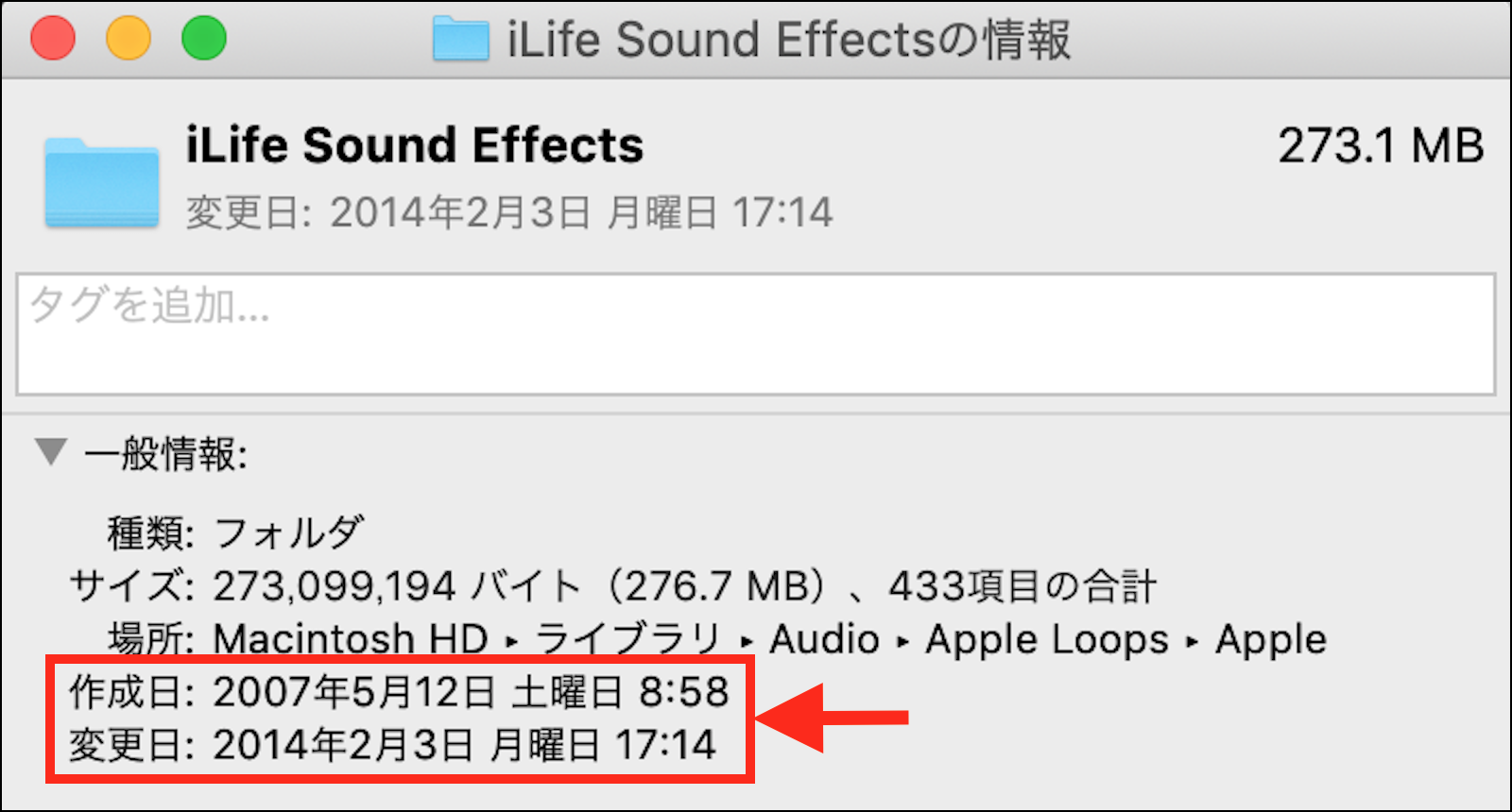 「iLife Sound Effects」フォルダの「情報」を確認すると、下の画像の様に「作成日」が「2007 年 5 月 12 日」、「変更日」が「2014 年 2 月 3 日」となっており、フォルダの名前に「iLife」が付いている事から、「iLife '11(「GarageBand(6.0.5)」)」以前のバージョンに関係する物である可能性が有りますね。