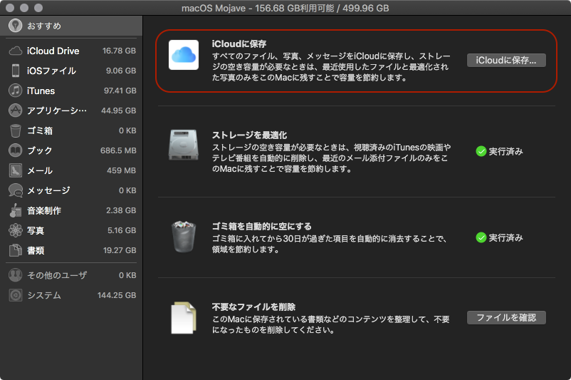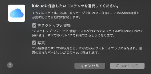 このMacについて→ストレージ→管理... で 「iCloudに保存...」 はどのように設定していますか?