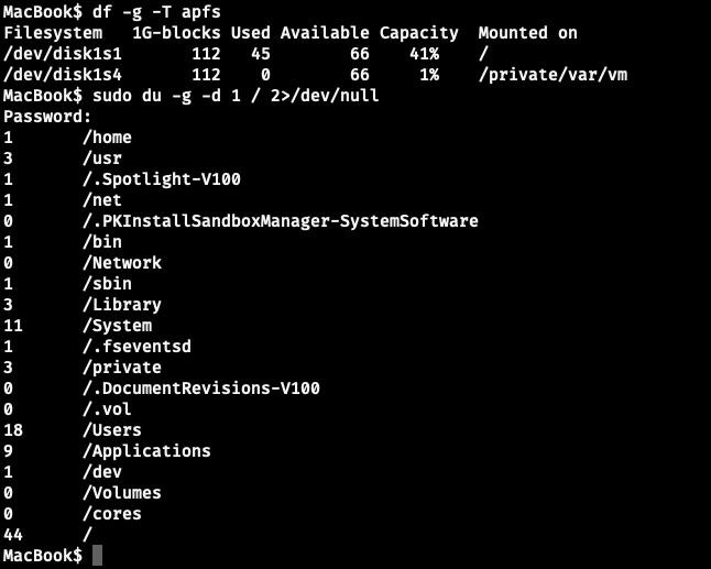というわけで、問題を洗い出すために、再びTermimalで下記コマンドを実行して下さい。duコマンドは結果が出るまで数十秒〜数分掛かります。