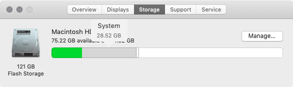 当方のMacBookAirは 使用頻度は低い方ですが、ストレージ121GBに対し、空きは36GBなので、そんなもんかと。