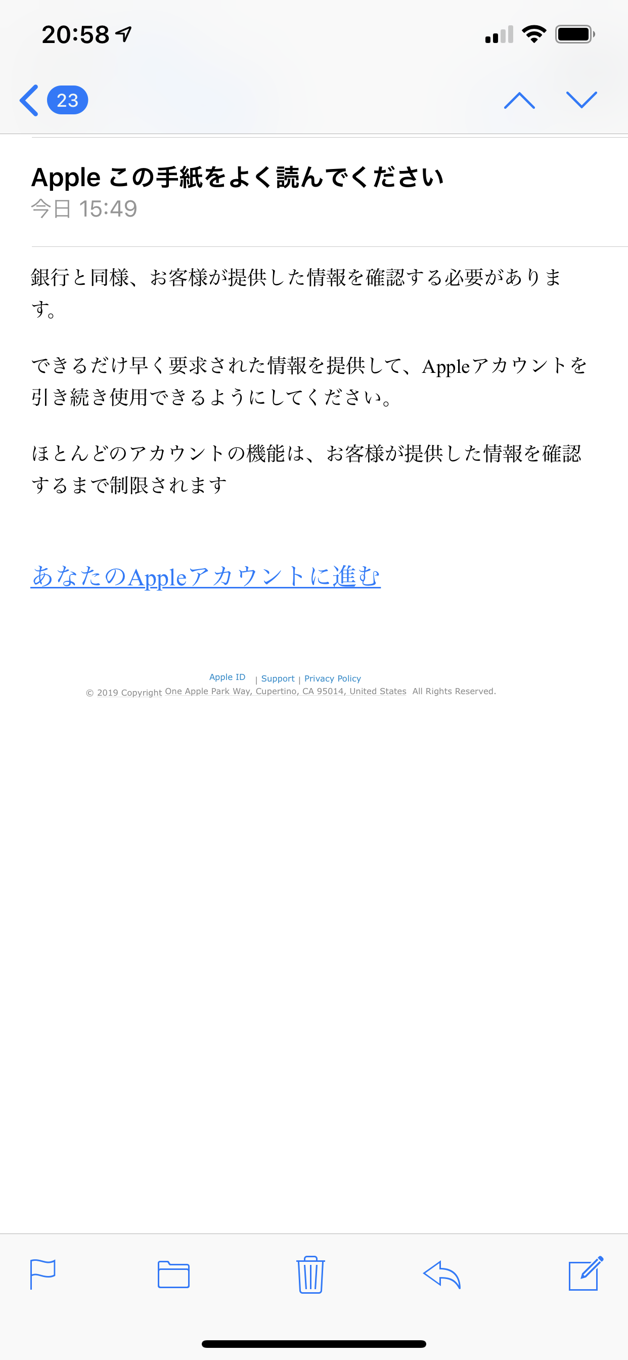 4)メールの送信元のアドレスは偽装できます。 Appleからのメールの様に見えても信用できないです。