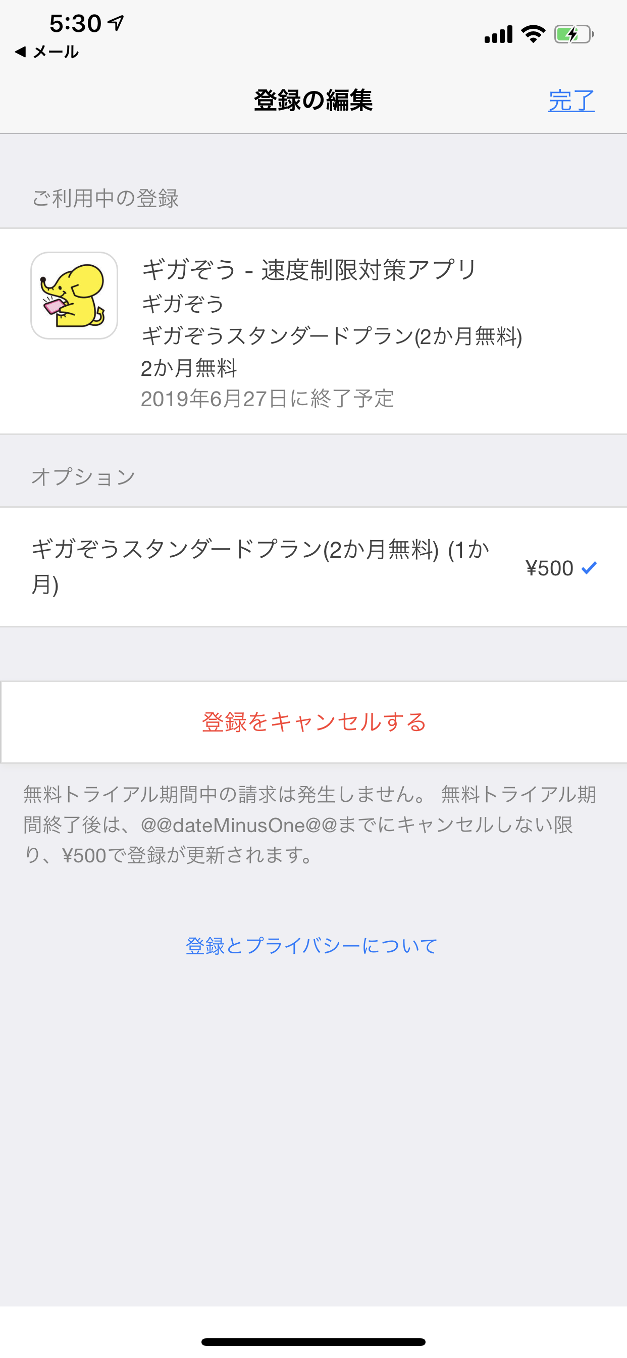 3月9日に機種iPhoneでギガぞうというアプリを入れ、解約したいのですがサイトなどで示されている方法でAppStoreやiTunesから入ってもサイトから入っても<登録をキャンセルする>というボタンが出てこないので解約ができません。