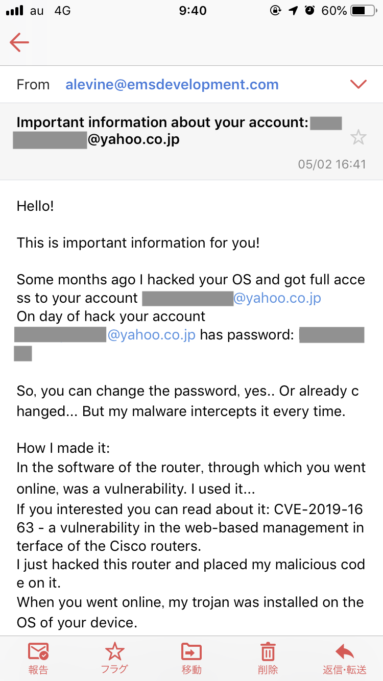 でもないんですよね⋯。私のところに来たものも(web上で話題になっているものも)かなり昔に使っていたパスワードがちゃんと書かれていたりするんですよね⋯。何かの拍子に何処かから漏れたりしたものなんでしょうけど、パスワード等を一度も変えていなかったりしたらビンゴしていたりすることもあるみたい⋯。