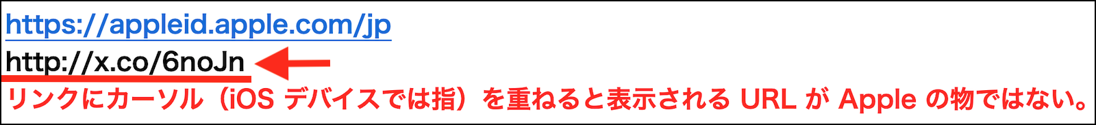 また、メール本文中の Apple ID アカウントページのリンクにカーソル(iOS デバイスでは指)を重ねると表示される URL が、本来の「https://appleid.apple.com/」ではなく、下の画像の様に Apple とは全く関係の無いサイトの URL(つまり偽サイトの URL)が表示されますので、フィッシングメール確定 です。