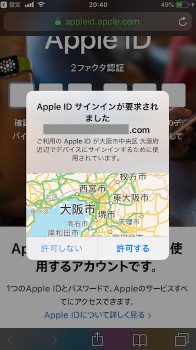 2ファクタ認証を設定したApple IDにサインインの操作がされた場合に、その旨を本来のユーザに知らせる画面。