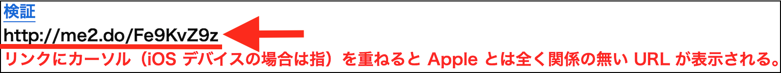 また、メール本文中の「検証」のリンクにカーソル(iOS デバイスの場合は指)を重ねると表示される URL が、本来の Apple ID アカウントページの URL である「https://appleid.apple.com/」ではなく、下の画像の様に Apple とは全く関係の無い URL(つまり偽サイトの URL)が表示されますので、フィッシングメール確定ですね。