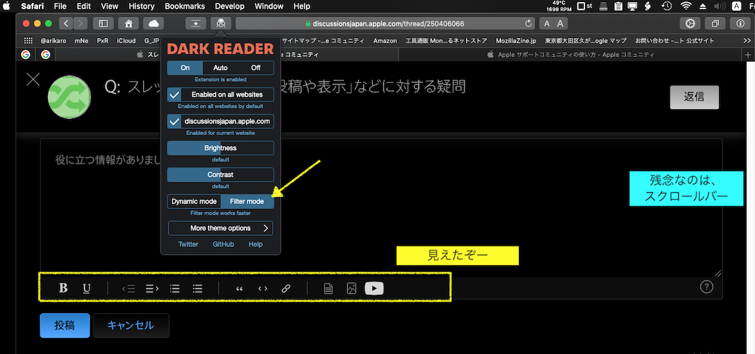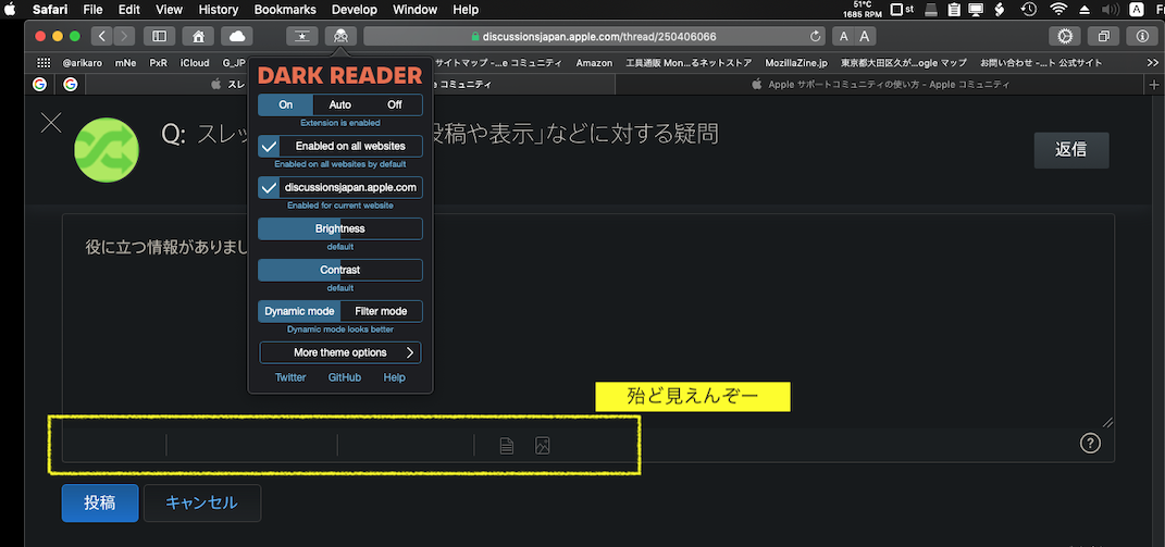 で、結果としてはとても素晴らしいく、Mojave+Dark+DarkReaderにかなり接近した性能です。