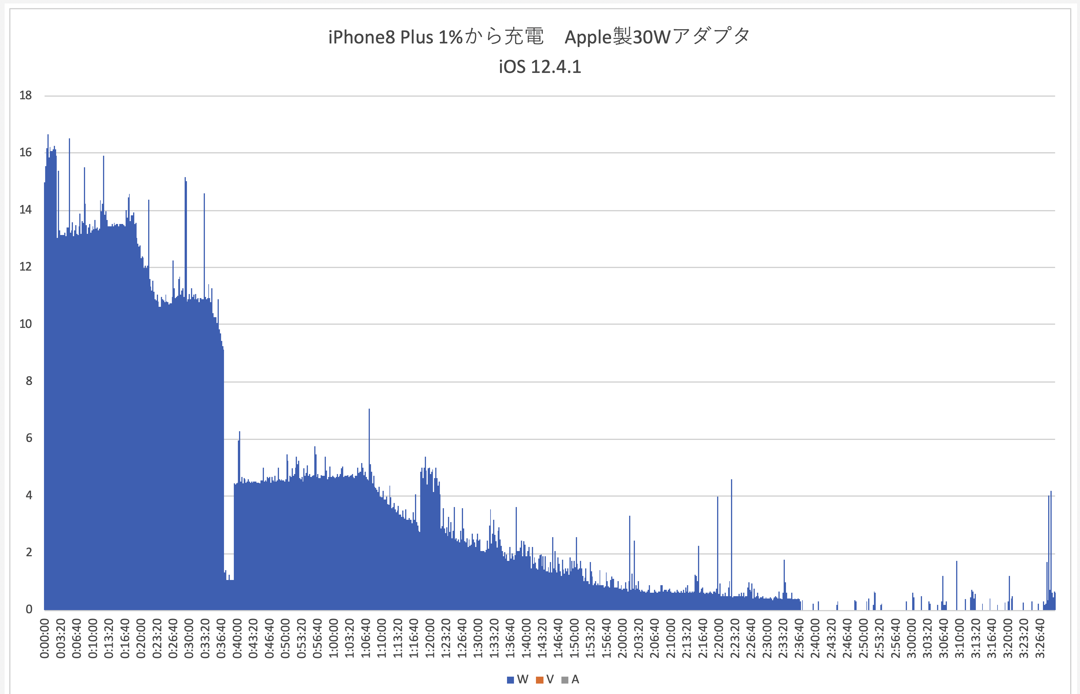 上記はiPhone8 Plus iOS12.4.1 の充電時のアダプタから出力される計測からワット数を算出した物です。Apple 製30W アダプタを使っています。