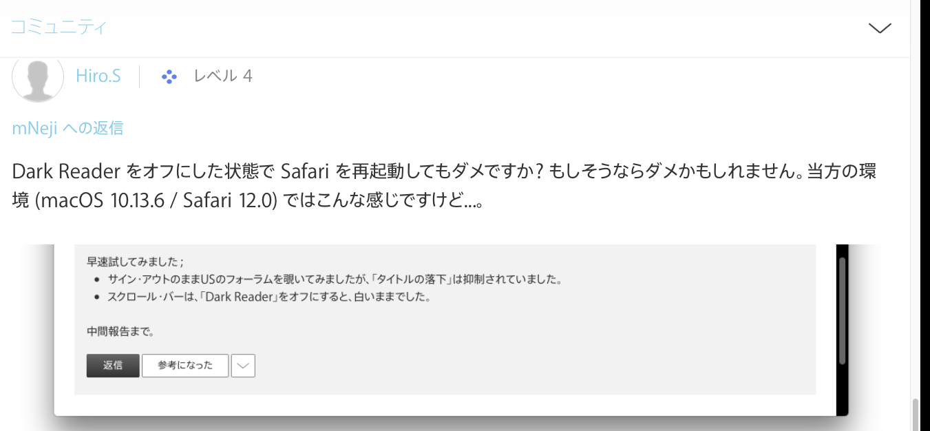 最近、ブラウズ(30件)の中にmacの関連質問があるか見ていると、2~6件/30件です。平均して4件/30~13%しかありません。そういえば、iPhoneのSafariでは結構早くから黒色化していました。もはや、フォーラムの改良工数はmacに割けなくなっているのだと、悟りました。
