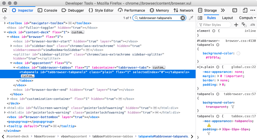 Firefox 67.0.3(en-US)なのですが、chrome://browser/content/browser.xulには、tabpanels#tabbrowser-tabpanelsはみつかりますが、stack.browserStackがみつかりません...