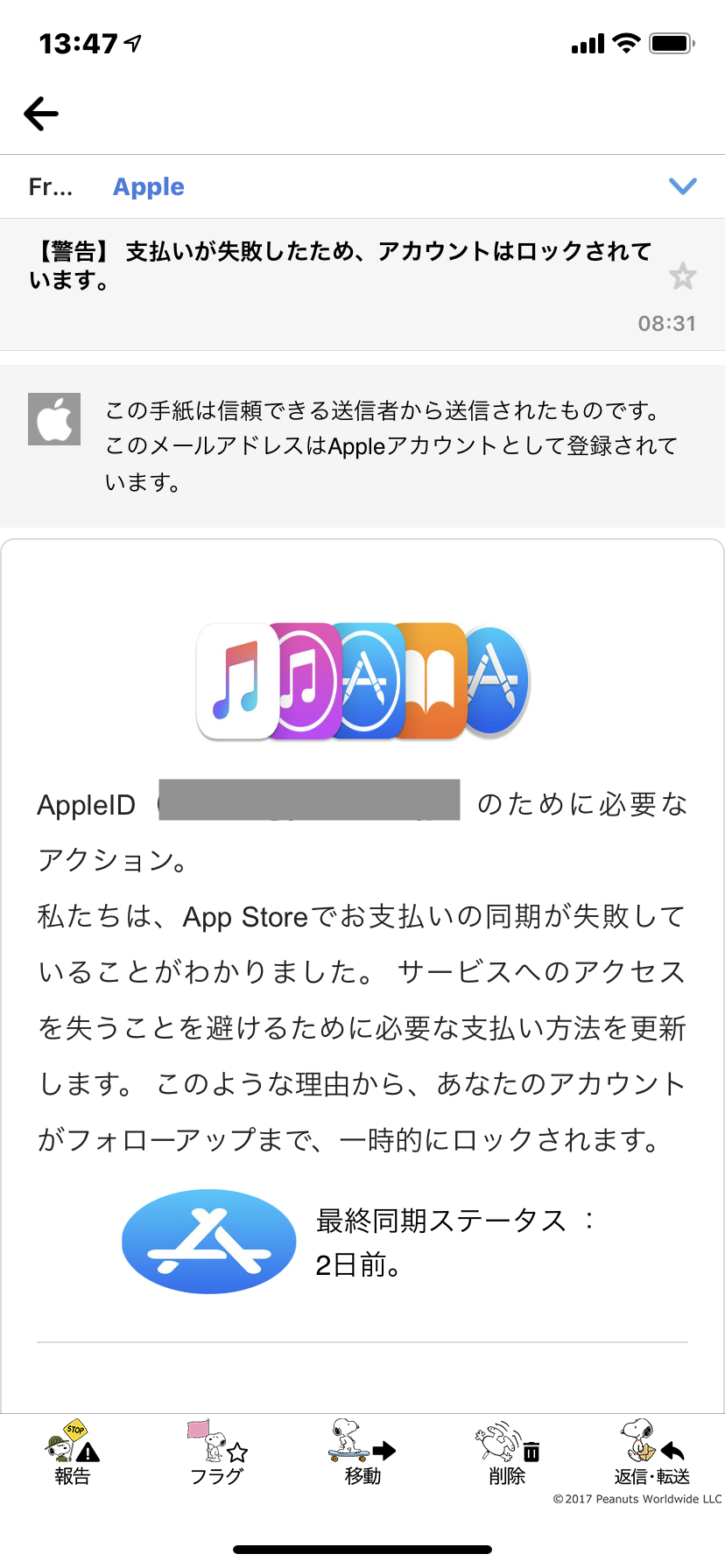 3)メールの本文に、お名前(Apple IDの管理サイトで登録したもの)が入っていない場合は、フィッシングメールの可能性が高いです。 Apple IDではなく、お名前の有無を確認してください。