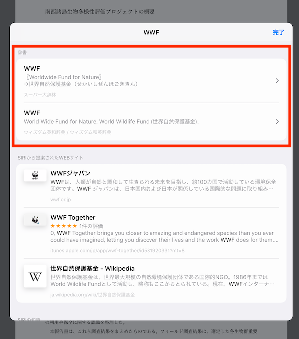 ipadでブラウジング中、HPであればipad内蔵辞書で「調べる」が使用可能ですが、