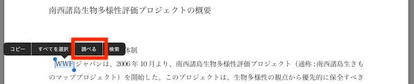 PDFファイルを閲覧中に日本語、英語を問わず、単語を指定しても「調べる」が出てきません。