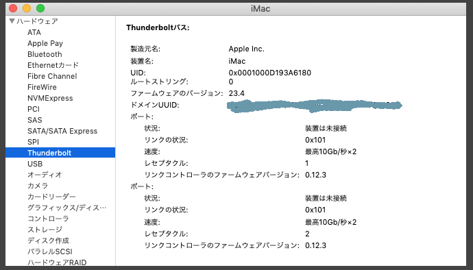 また失敗している時はシステムレポート内のthunderboltを見るとハードウェアが見つかりませんでした。と表示されています。成功時は画像のとおりです