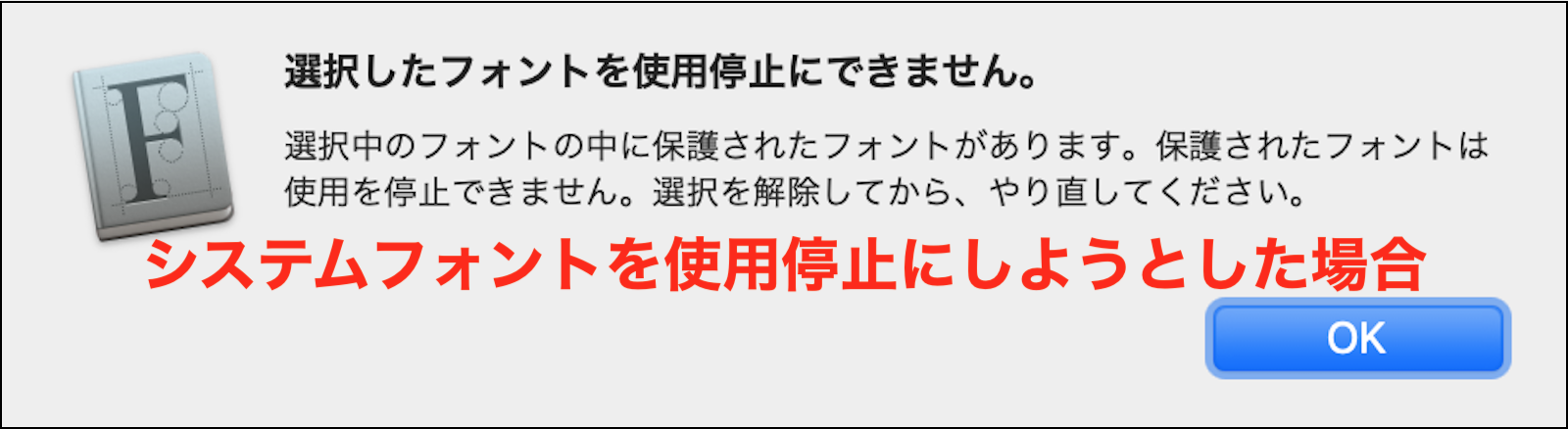 下の画像の様に、システムフォントを使用停止にしようとすると、同様のダイアログが表示されますが、システムフォントを使用停止または削除すると重大な不具合が発生する可能性が有る為、システムフォントを使用停止または削除する事は出来ません。