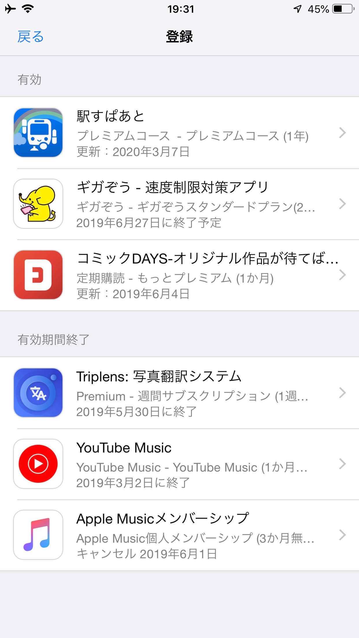 下の三つの内の二つが登録キャンセル後の期限切れ、Apple Musicは即座にキャンセルされ、キャンセルされた日を表示しています。