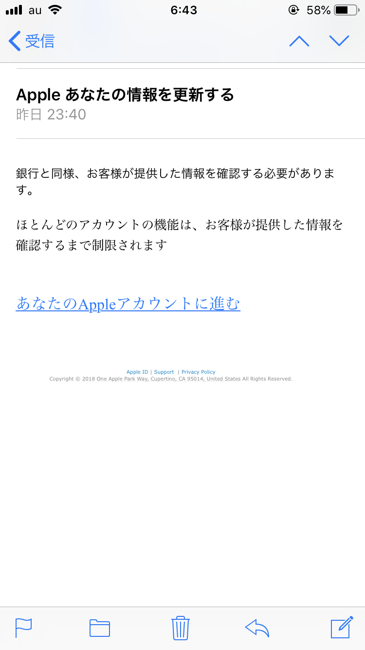 4)メールの本文にある『あなたのAppleアカンウトに進む』のリンクに指を乗せたままにすると、リンク先のURLが表示されます。 そのURLの文字列がApple IDの正規の管理サイトのURL(https://appleid.apple.com/)と異なることを確認して下さい。 これ以外のURLはありえず、それ以外は全てフィッシングサイトになります。
