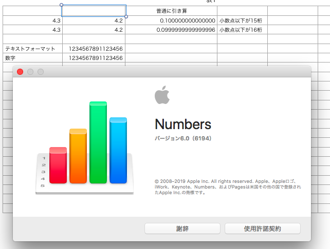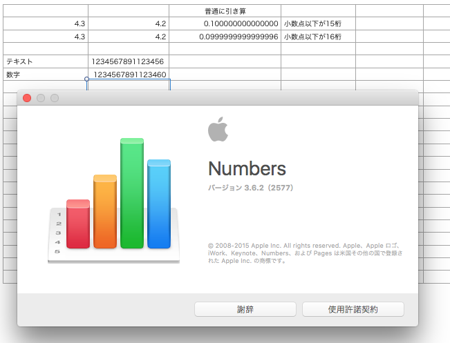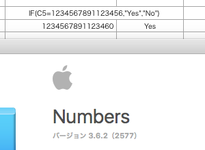 Numbers 6.1 で、数字フォーマットでは16桁の下一桁が四捨五入される。