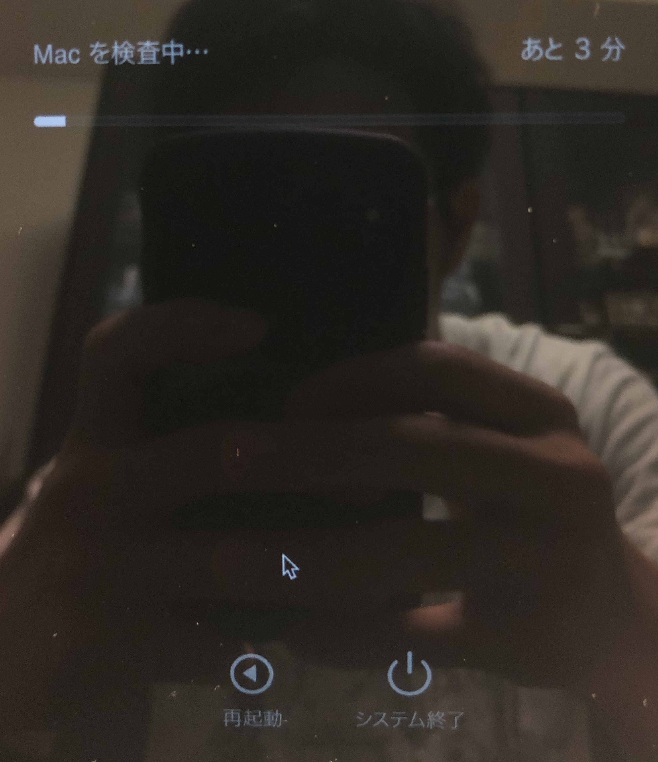 解決策の一つとしてApple diagnosticsを教えてもらったので試してみたところ、「Macを検査中・・・ あと3分」とでている下にあるバーが少し進んだところで止まってしまい、マウスポインタも動かなくなってしまいました。(参考画像添付)
