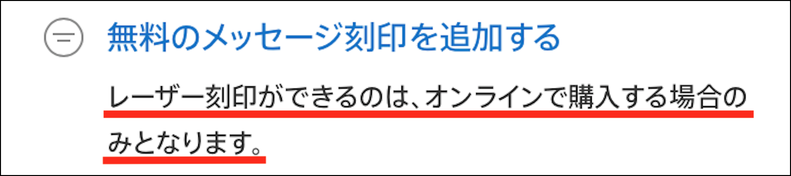 残念ながら、AirPods の購入ページに下の画像の様に明記されていますので、レーザー刻印が出来るのはオンラインの Apple Store で注文購入する場合のみ で、後からレーザー刻印を行う事は出来ません。