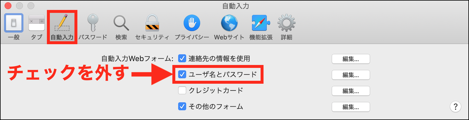 自動入力されるのがパスワードのみである場合は、「Safari」メニュー >「環境設定」>「自動入力」タブ >「自動入力 Web フォーム」の「ユーザ名とパスワード」のチェックを外して見て下さい。