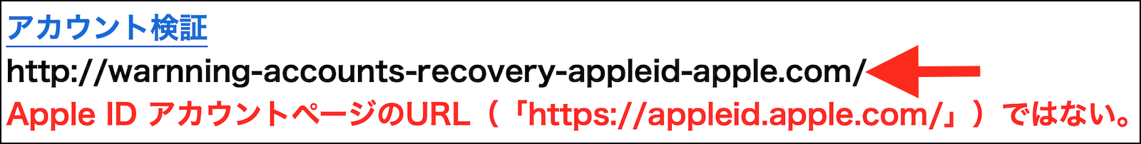 ● メール本文中の Apple ID アカウントページのリンクにカーソル(iOS デバイスの場合は指)を重ねると表示される URL は、「https://appleid.apple.com/」になります。