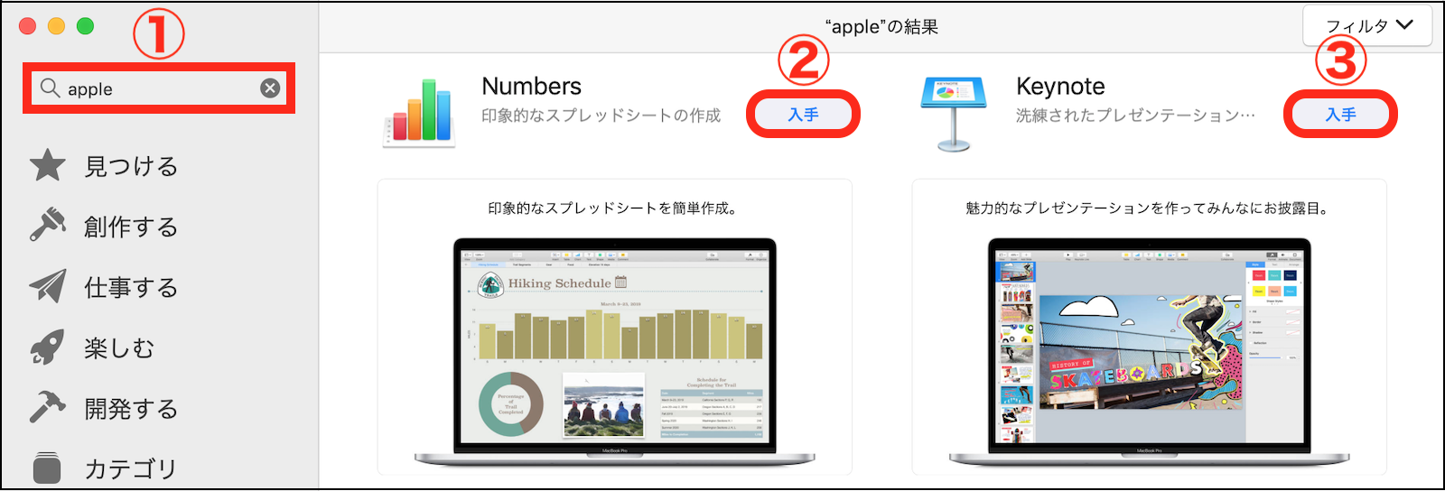 存在していない場合は、下の画像の様に「App Store」ウインドウ左上に有る検索欄に「apple」と入力し、「GarageBand」、「iMovie」、「Keynote」、「Numbers」、「Pages」の右側に表示されている「入手」ボタンをクリックして、1項目ずつダウンロード&インストール して下さい。