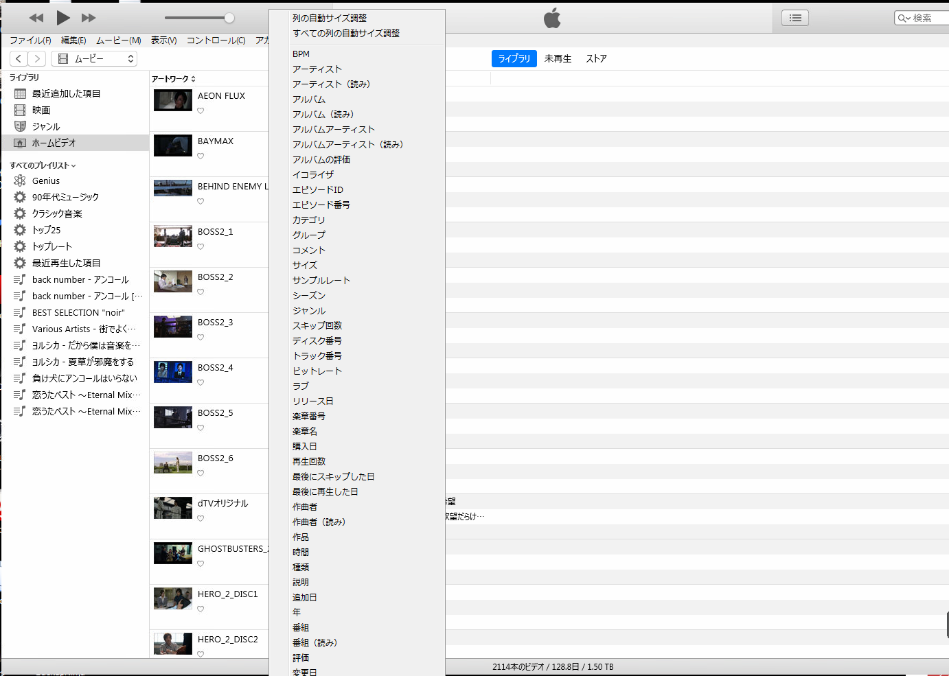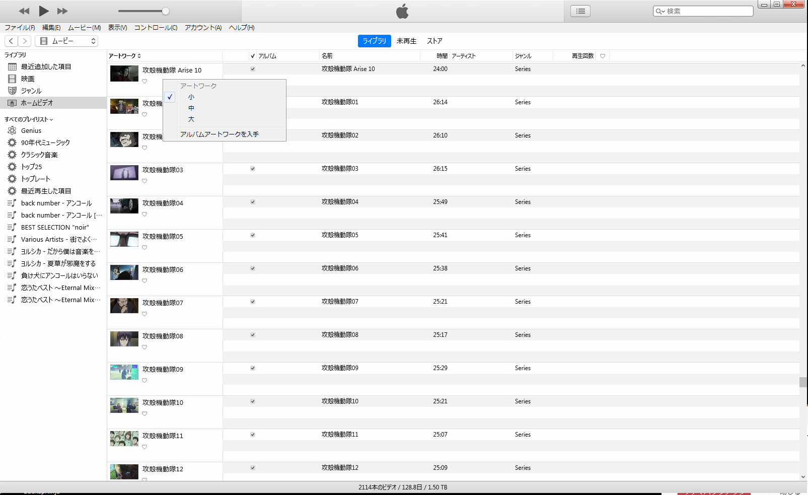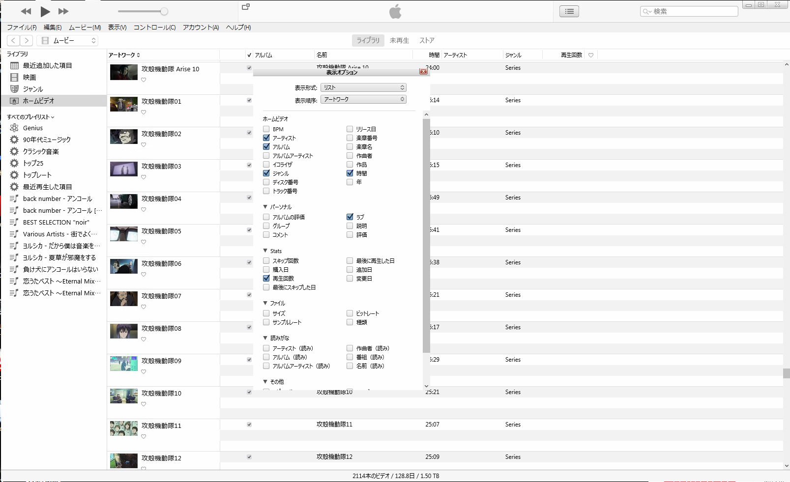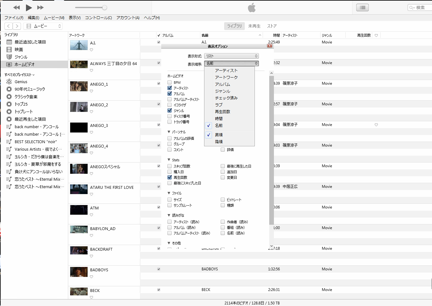 iTunesのムービーのホームビデオの表示形式のリストでアートワークを表示 非表示にする方法を教えてください