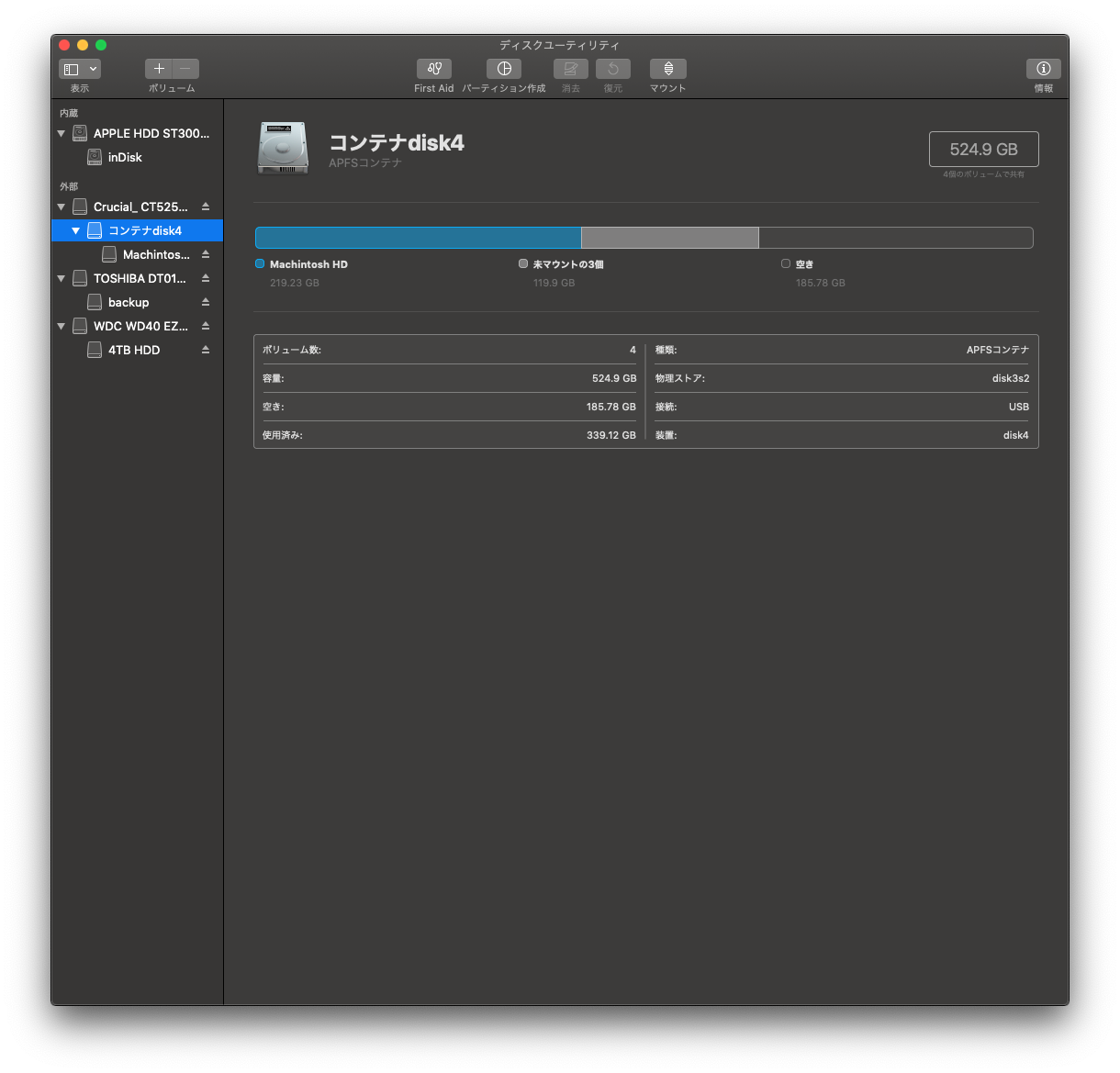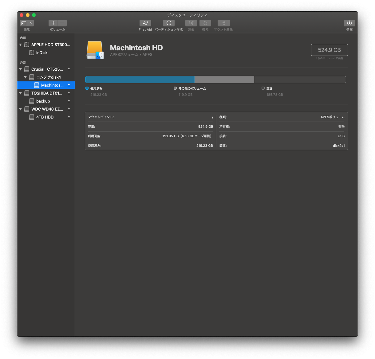 外付けのSSDを起動ディスクとしていますが、500GBあるうちの118GBをコンテナ内の他のボリュームがしめています。