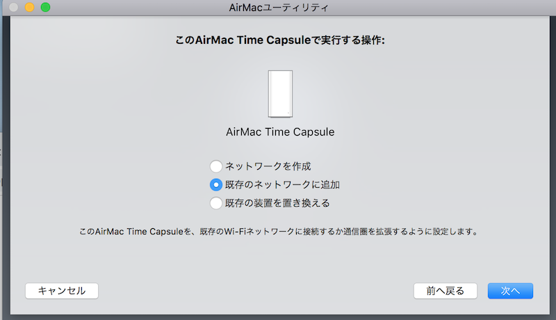 いろいろネットでしらべていると、AirMacのベースステーションをリセット、AirMac ユーティリティの画面から「既存のネットワークに追加」を選択して、自宅の WiFiの名前を選択したらいいと書いてあったのですが、その画面にいかず、もとの画面に戻ってしまいます。