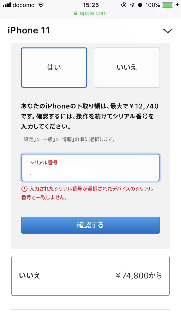 表示されているエラーメッセージが、「入力されたシリアル番号が選択されたデバイスのシリアル番号と一致しません。」との事ですので、「シリアル番号」をコピー&ペーストされているのであれば、下取りに出す iPhone の「モデル」及び「容量」の方が間違っている と言う事は有りませんでしょうか?