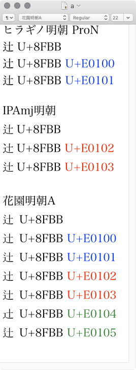 その文字をテキストエディット、メモ、Jedit Ωなどにペースとしてヒラギノで見るとちゃんと点ふたつの「辻」で見えます。