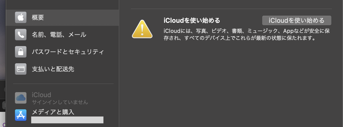 「Apple ID」を開くと、”iCloudを使い始める”の文字の前に”黄色三角!”が表示されていました。