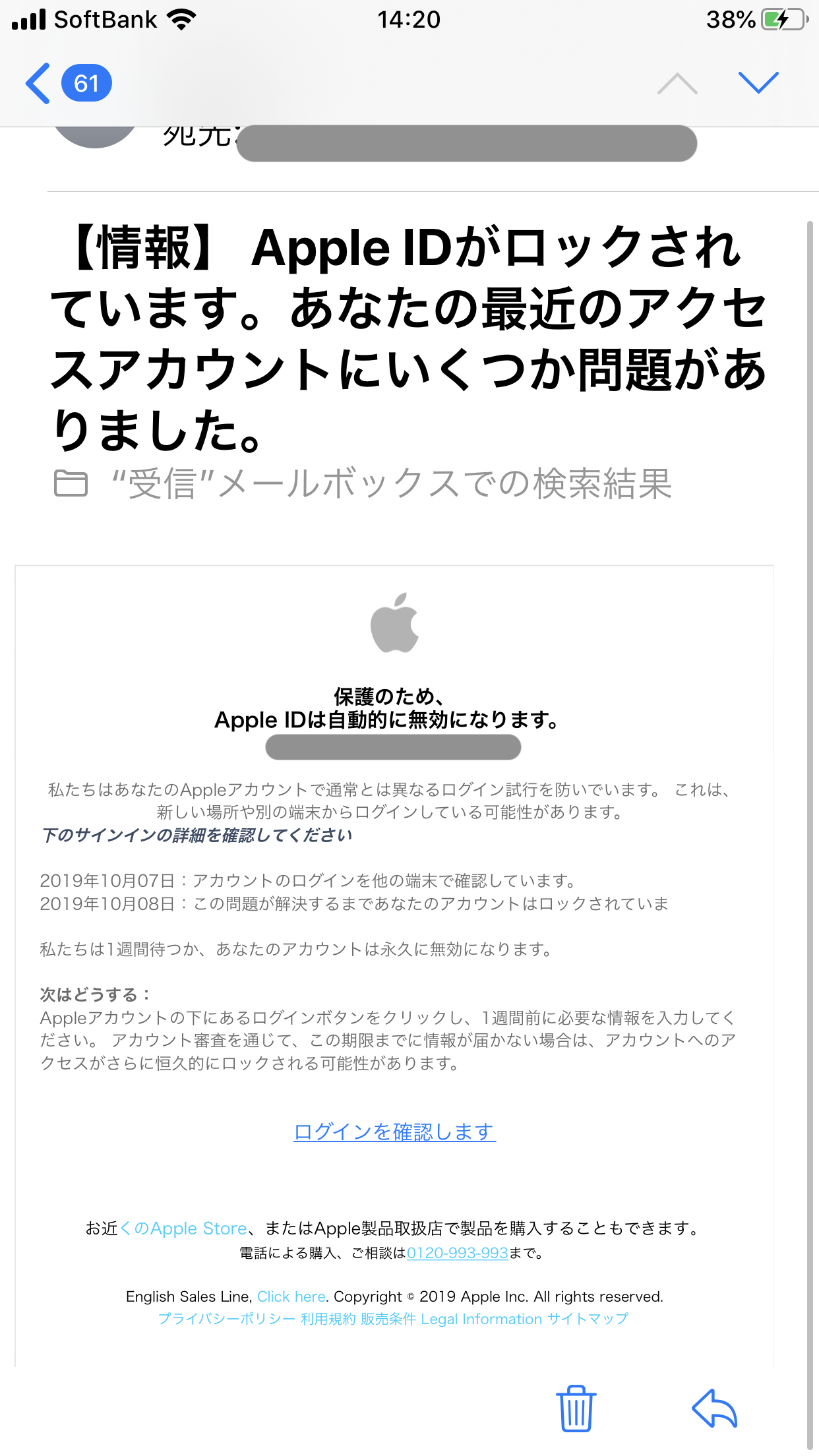 1)フィッシングメールです。 Appleからのメールではありません。 メールを無視して削除します。 あるいは、迷惑メールフォルダに移動させた後で削除します。