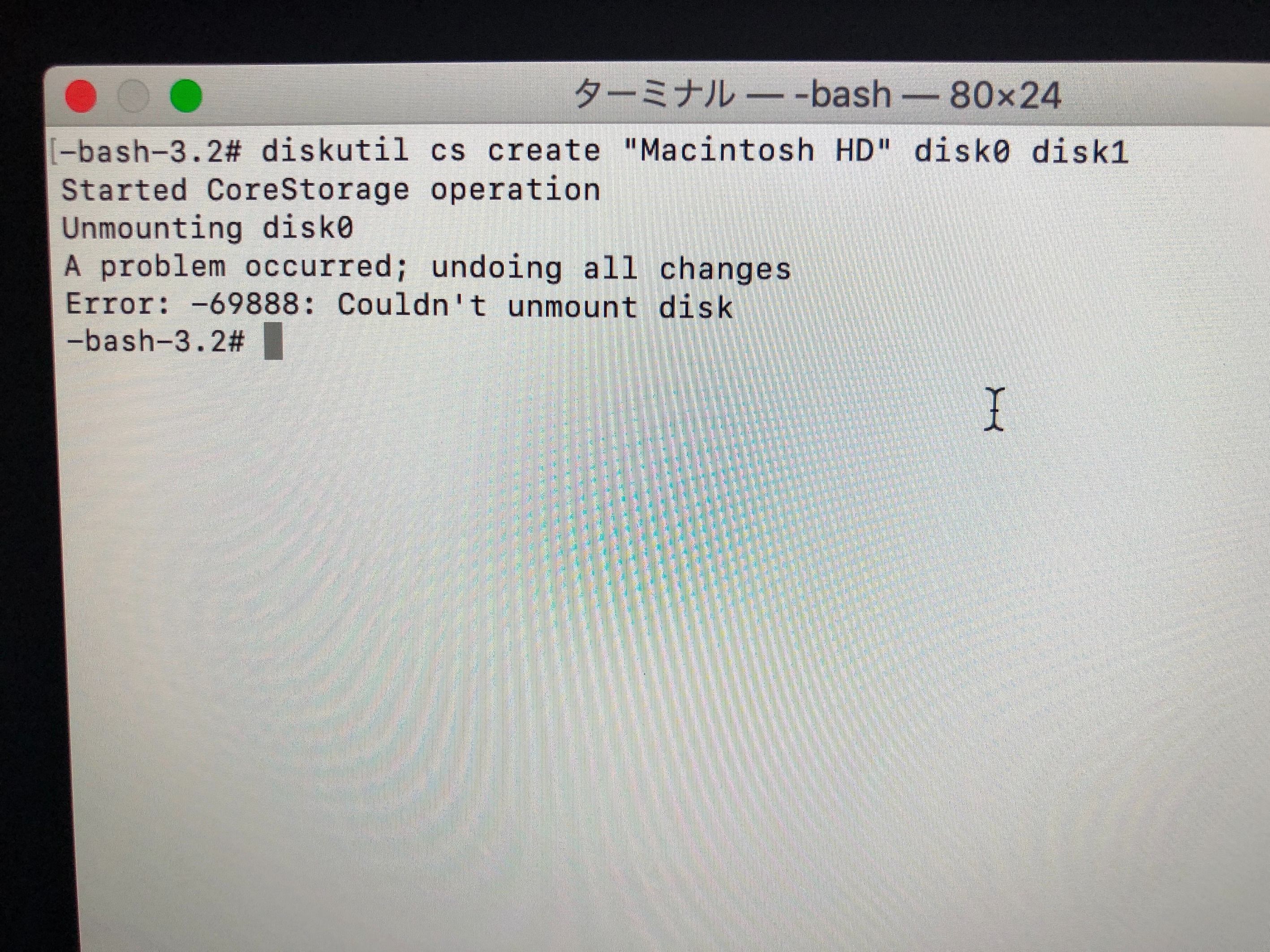 ディスクユーティリティとcommand+r、それぞれでFirst Aidをかけると、「ファイルシステム検査の終了コード8」が表示され、問題の修復はできませんでした。
